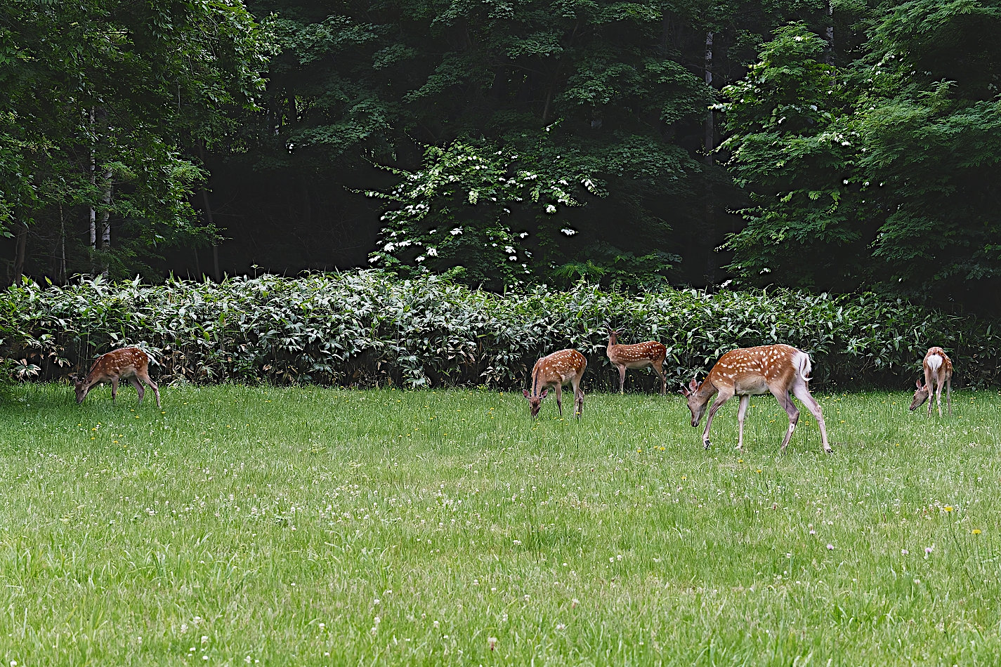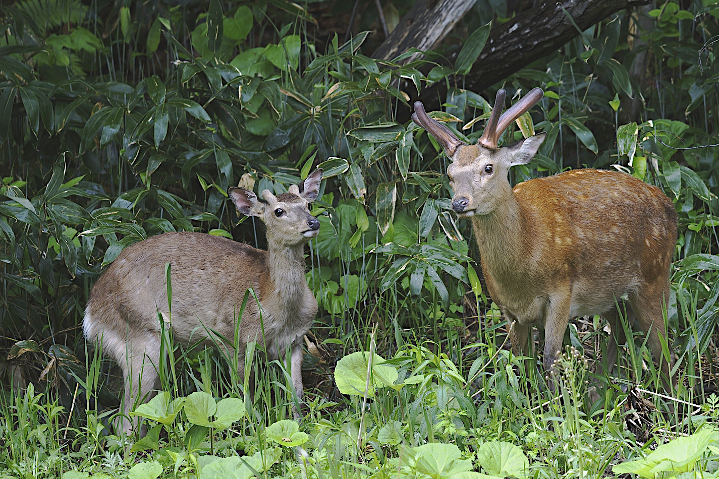 もう帰ろうと思った時、雷雨に見舞われ近くの休憩所で暫し雨宿り。雨が上がり歩いて行くとエゾシカの親子に遭遇。袋角の具合からすると、母と子のようだ。