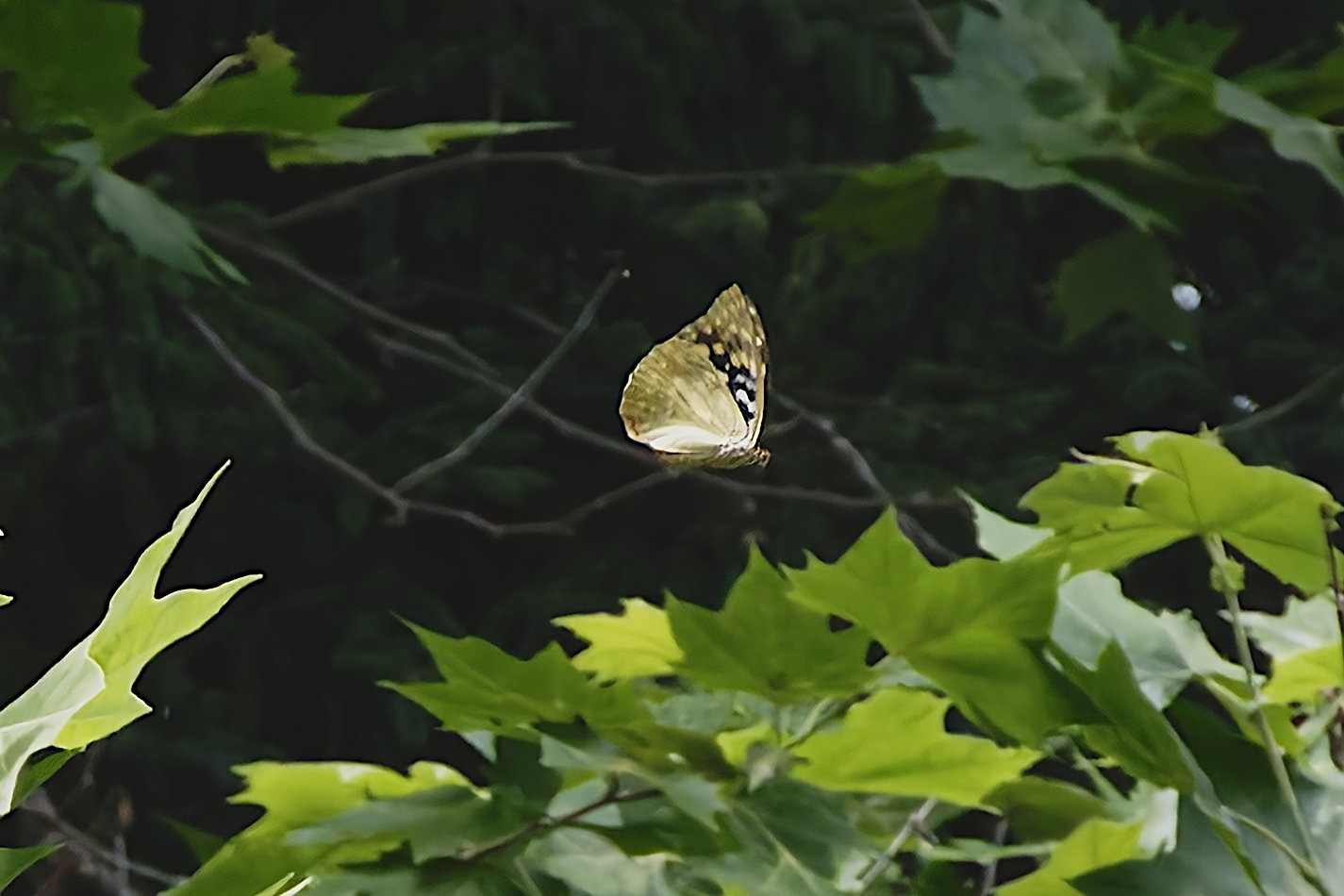 これは葉の中で、飛んでいるのが分かったので、とにかく急いで、シャッターを切ったら写っていた。葉の中のオオムラサキを探している余裕などないのだ。