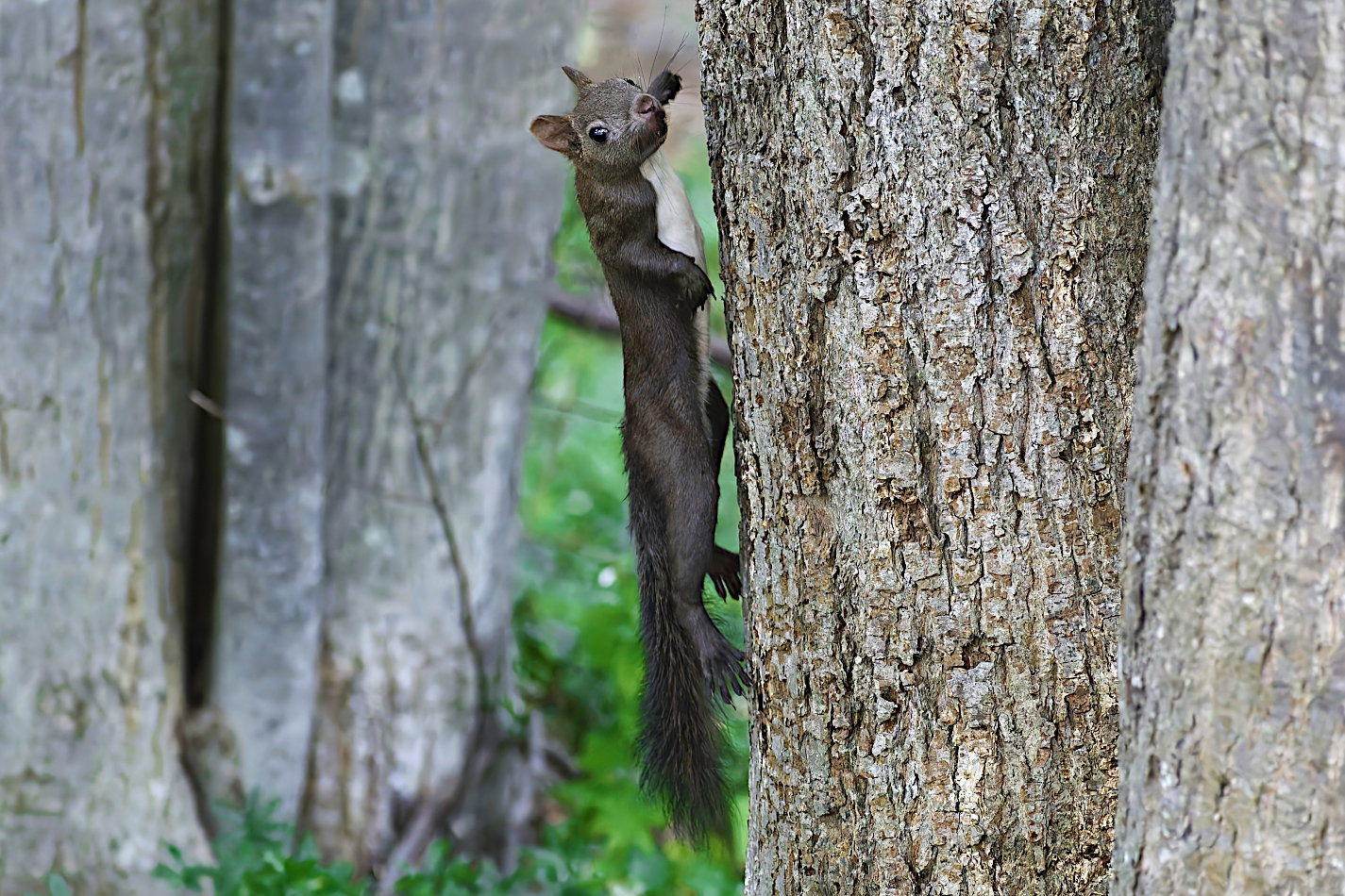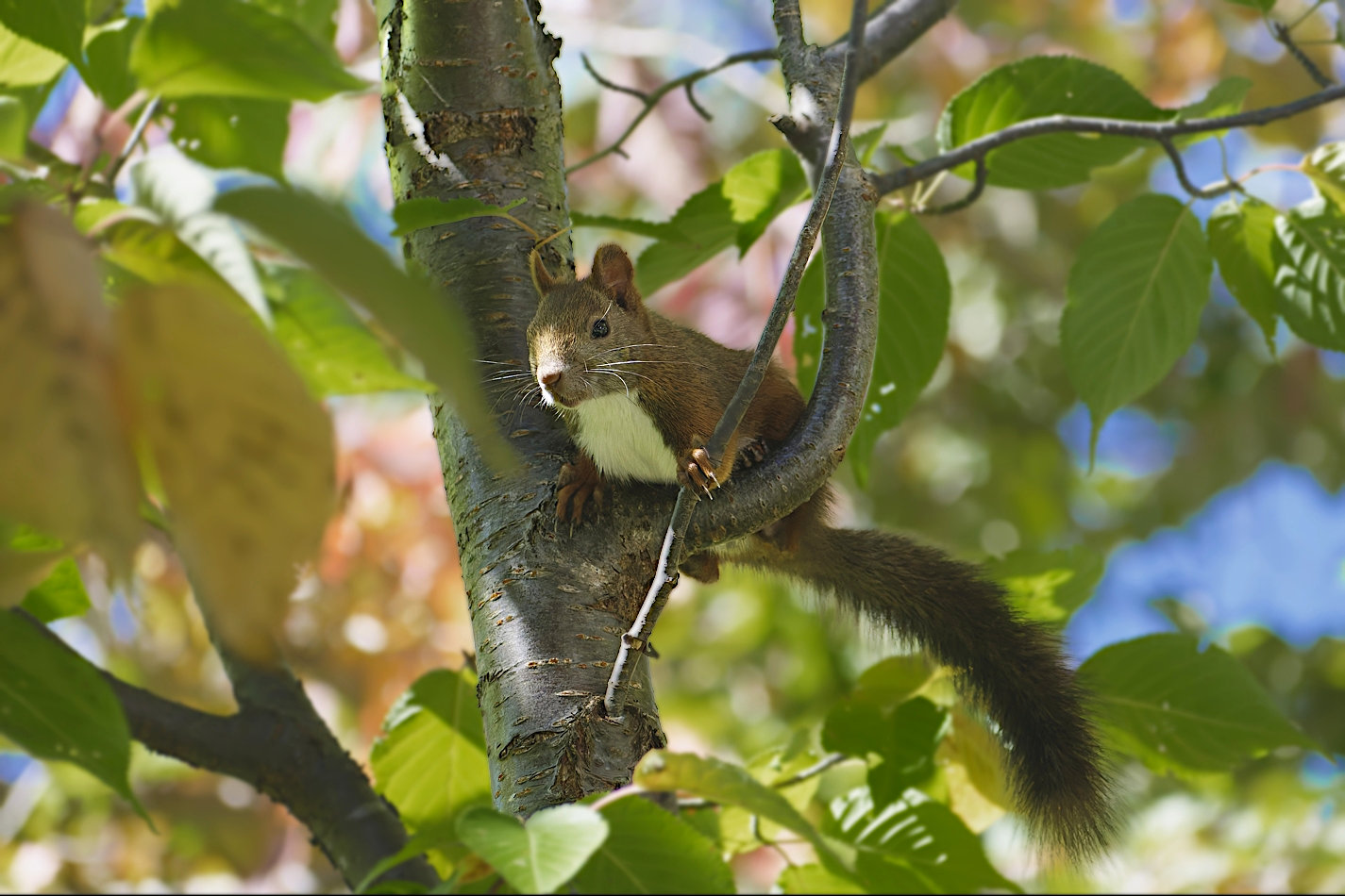 スズメバチの巣を気にしつつベンチで休憩後、エゾリスがいないか見に行くと、遠くの枝の上で活動中。その後を追って撮った中で、これがベストショット。
