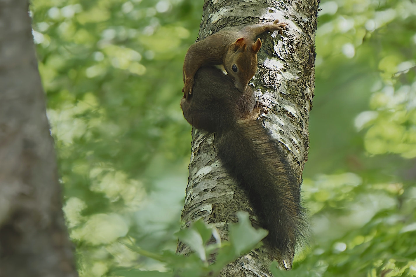 その時、すぐ脇の木にエゾリスの姿が目に入った。すかさずカメラを向けると、びっくりした様に走り去り、一匹は木の上に、もう一匹はもっと遠くの木に向かって走って行った。