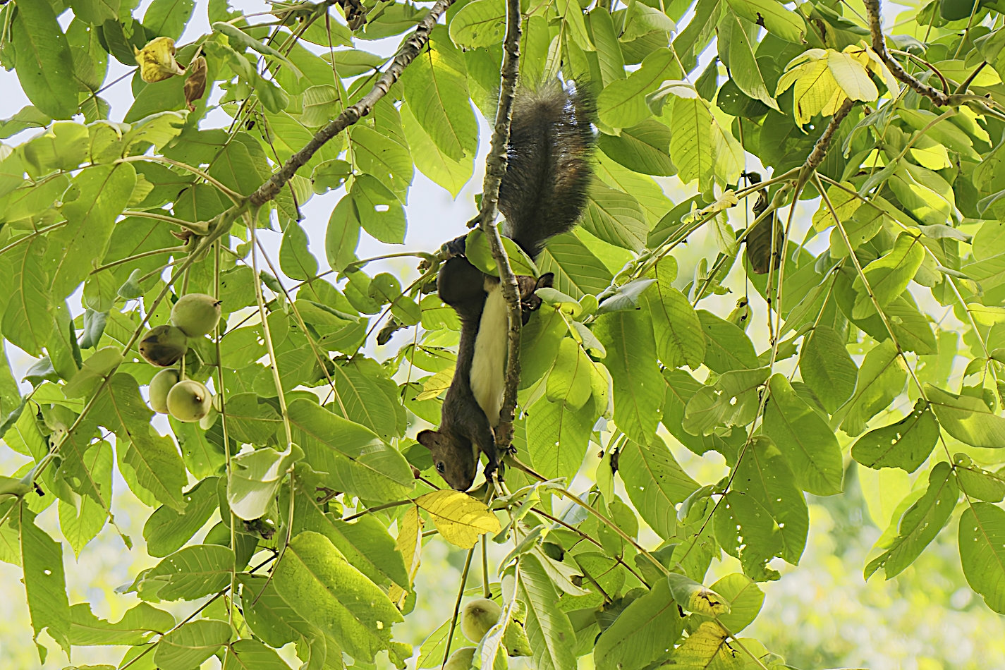 この辺では珍しい早朝の⛈️🌩️⚡におったまげたのか、公園にはカラ類さえも見当たらず。仕方ないので帰りも緑道にすると、オニグルミを房ごと咥えて走り回っているエゾリスがいた。この隠し場所が中々定まらず、同じシーンを3回ほど見たが、遂に決めたようだ。