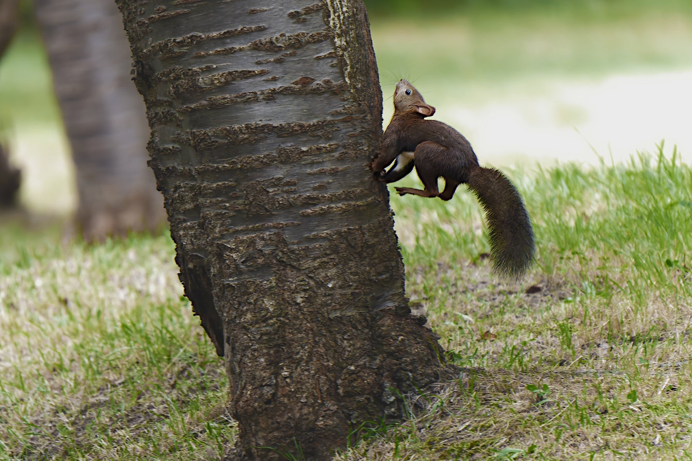 公園エリア近くの緑道で、エゾリスが走って来て脇の木に飛び乗った。こんな時はAFの速いD500が、その真価を発揮した。