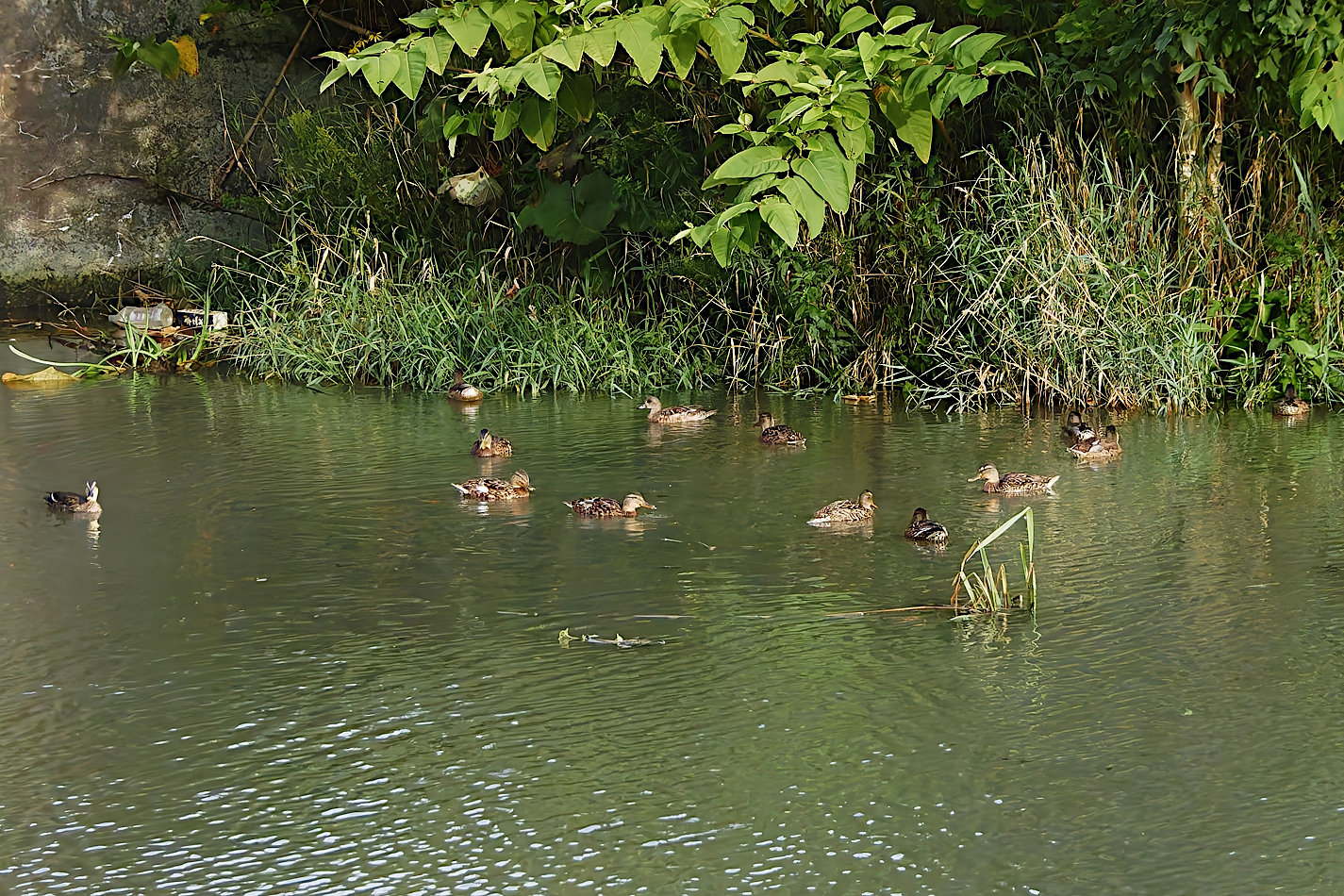 あのマガモ一家は未だ池にいるのか、確かめたくなり立ち寄ってみたら幸運にも、ちょうど水路に向かっている最中だった。そこで、後を追いながら数えてみたら、子供だけの6羽だった。残りの5羽はママと一緒のグループなの?