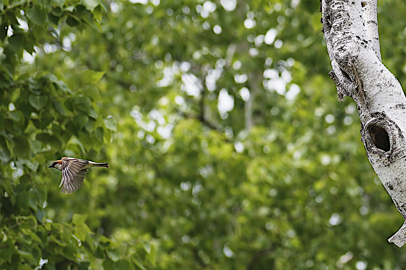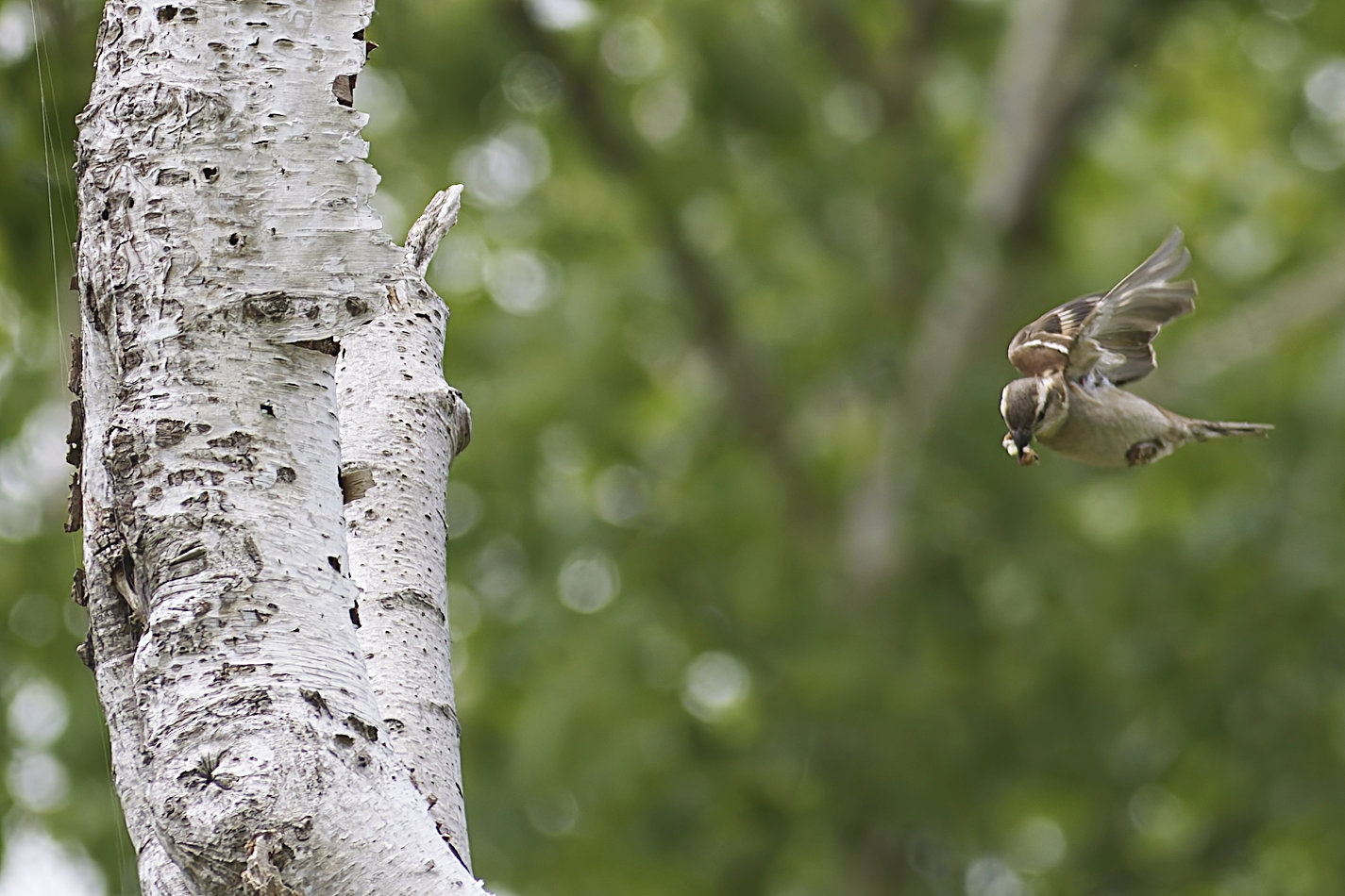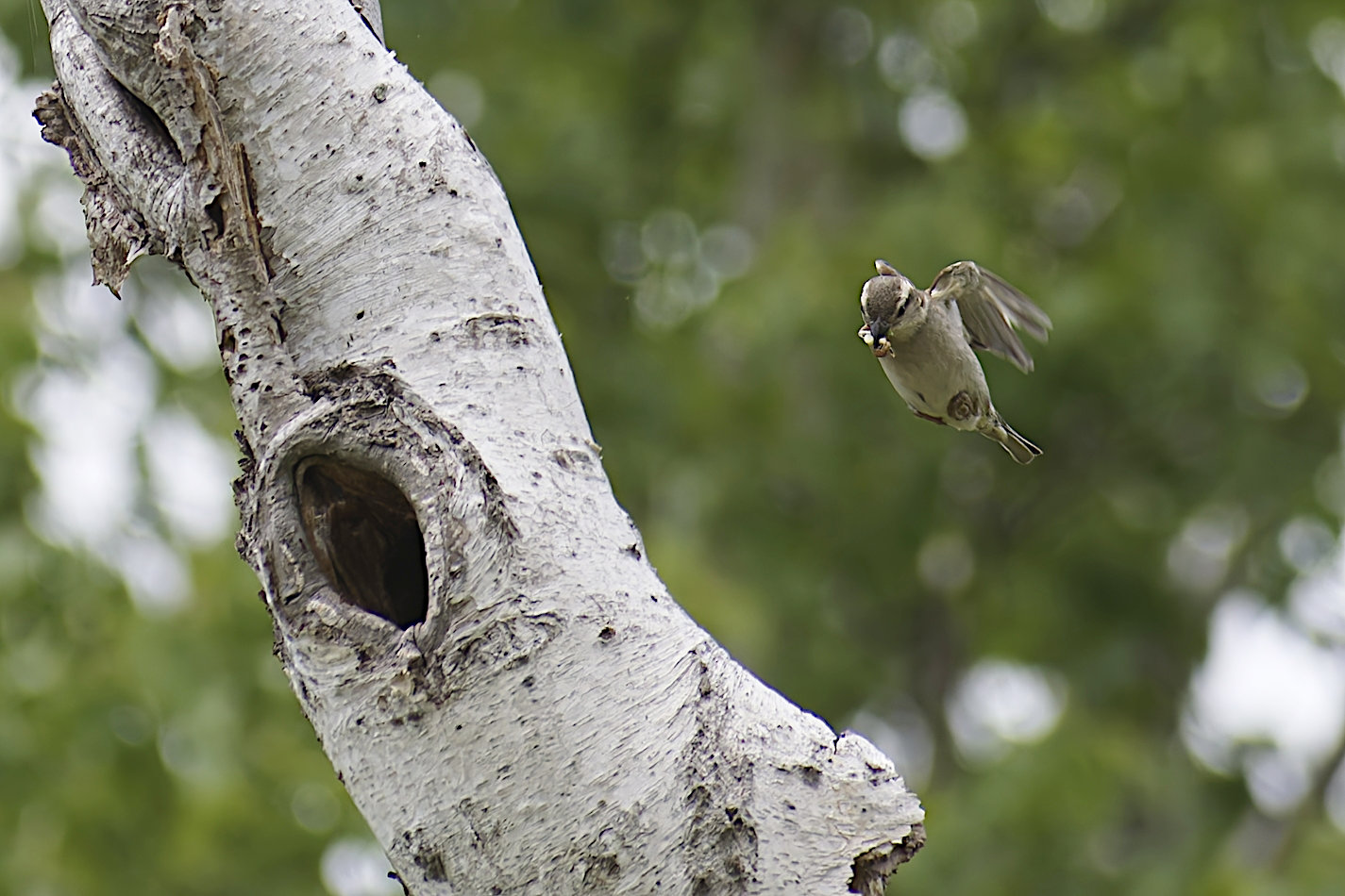 白樺林近くのニュウナイスズメだが、これを以って最後になるかも。それは、もう巣立ち寸前だから。一方、中間点の方はきょうもせっせと餌運び中。
