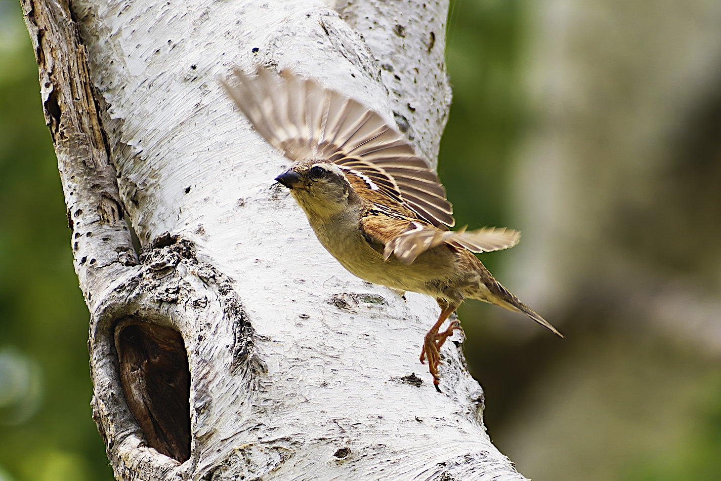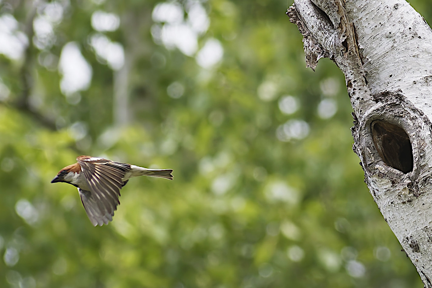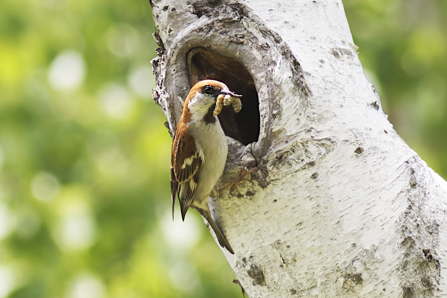 白樺林近くのニュウナイスズメだが、これを以って最後になるかも。それは、もう巣立ち寸前だから。一方、中間点の方はきょうもせっせと餌運び中。