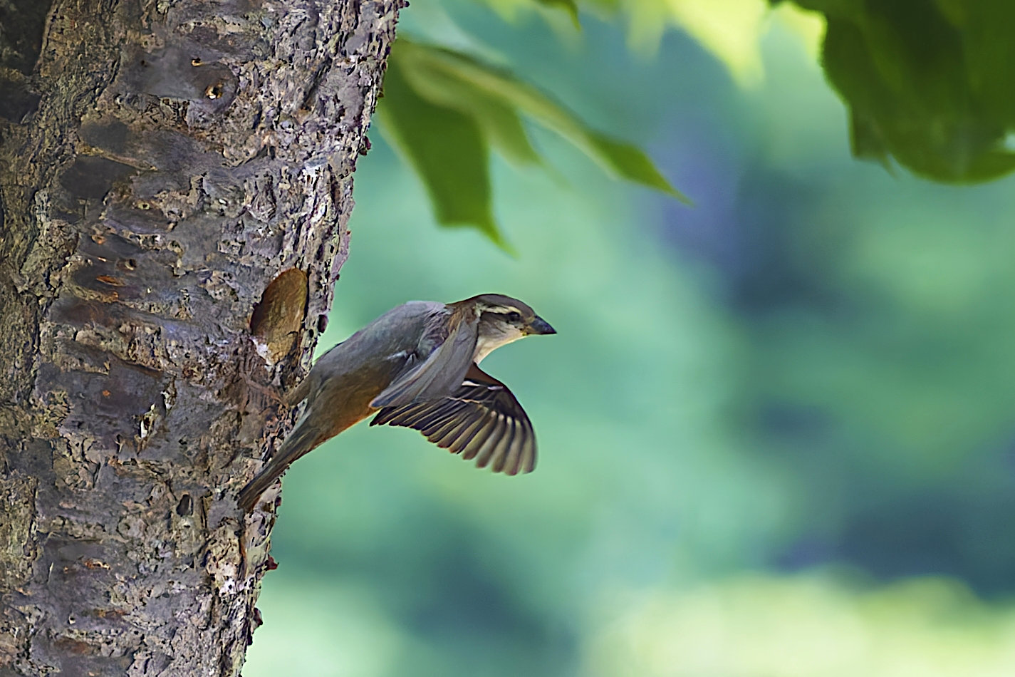 緑道では何も撮れなかった。公園に入ると先ず一休み。次に向かうのはニュウナイスズメ巣穴巡り。最初の所で良く見るのはこんなスタイル。この時は連写のタイミングが遅れ、巣穴へ向かう撮影に失敗。