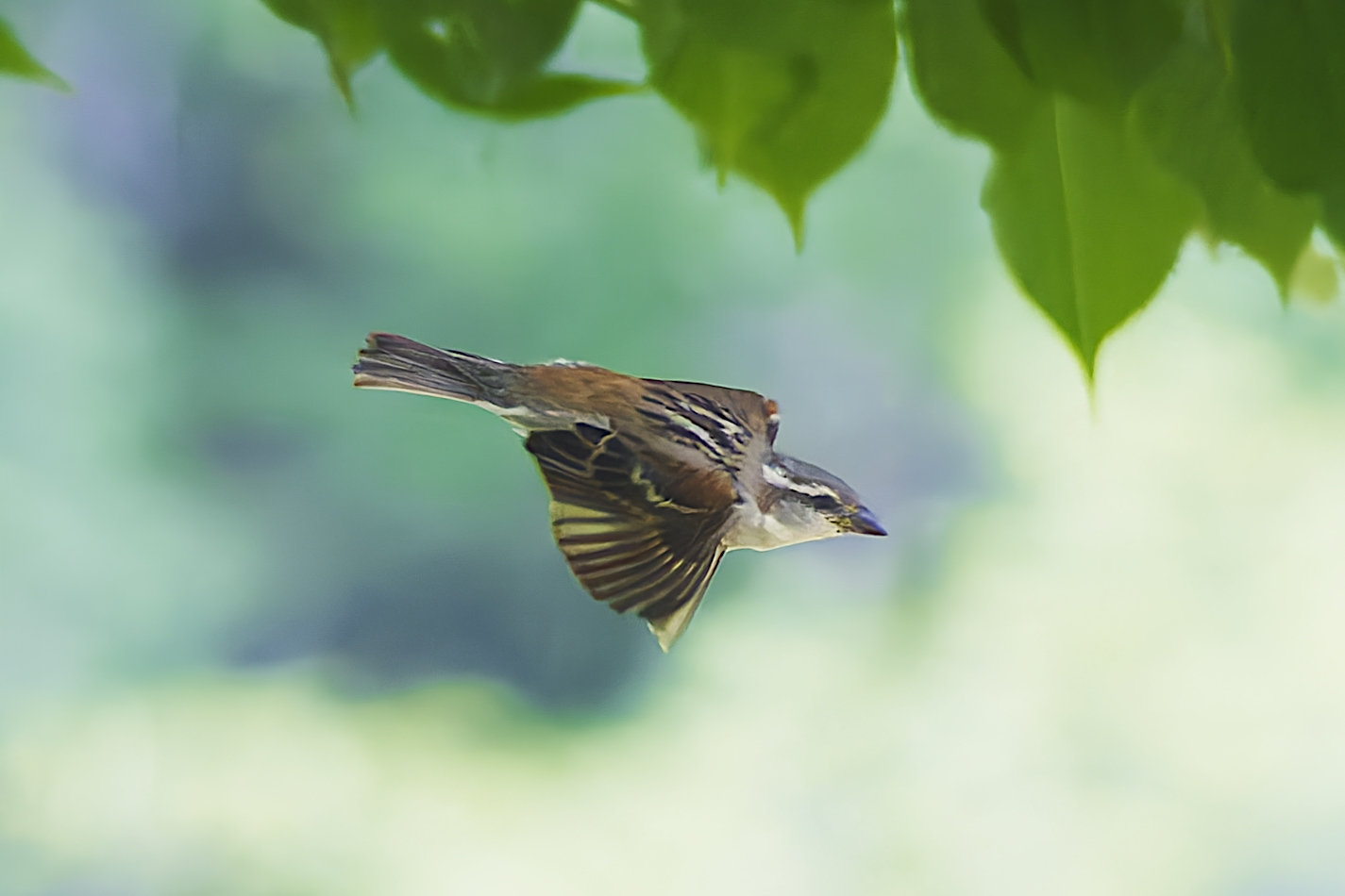 葉っぱの中で鳴いているのはスズメであったが、構図的に使えるかな、と思い一応撮っておいた。帰ってからPCで見ると、頬の斑や喉元が薄いので、幼鳥だと分かった。