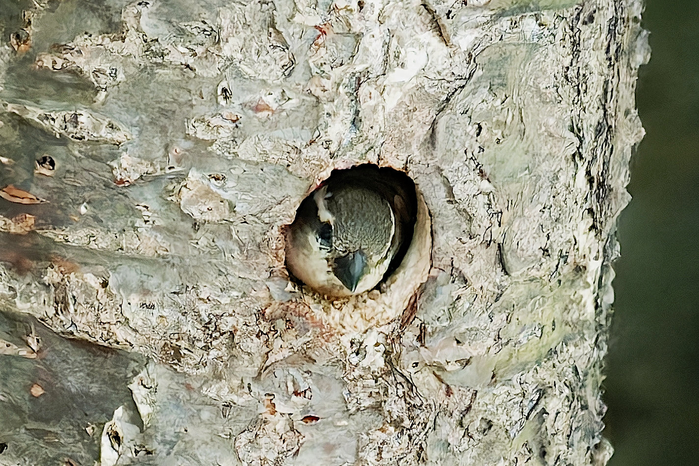きょうは2箇所で異変がおき、落ちついて撮っていられなかった。そのひとつはクマゲラの巣穴と思しき所に蛇が2匹入っていたこと。それと、このニュウナイスズメ。コゲラのヒナがいる巣穴に入っていったのである。でも何事も起きなかったようだ。この後、蛇が気になり戻ってみると2時間以上も居座ったまま。この結末は❓